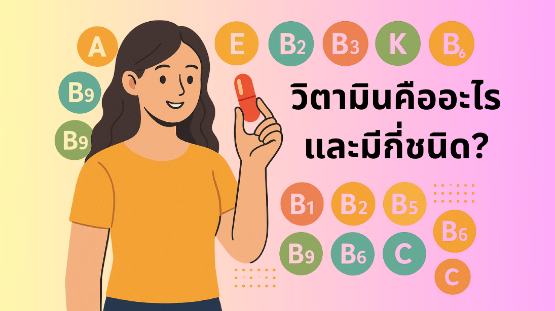 วิตามินมี 13 ชนิดหลัก ๆ แบ่งเป็น ละลายในไขมัน 4 ชนิด (A, D, E, K) และ ละลายในน้ำ 9 ชนิด (B1B12, C) การรับประทานให้ครบถ้วนจากอาหารธรรมชาติช่วยให้ร่างกายทำงานได้เต็มประสิทธิภาพ