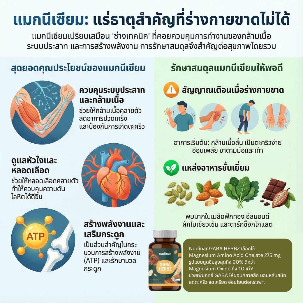- เสริมฤทธิ์ GABA ให้ผ่อนคลายลึกยิ่งขึ้น เพราะแมกนีเซียมเป็นตัวช่วยเปิดรับ GABA receptor ในสมอง