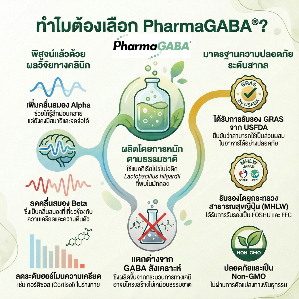 โดยสรุป การเลือก PharmaGABA® คือการเลือก GABA ในรูปแบบธรรมชาติที่มีการศึกษาวิจัยรองรับว่ามีประสิทธิภาพในการส่งเสริมความผ่อนคลายและคุณภาพการนอนหลับอย่างชัดเจน และมีการรับรองด้านความปลอดภัยที่สูง